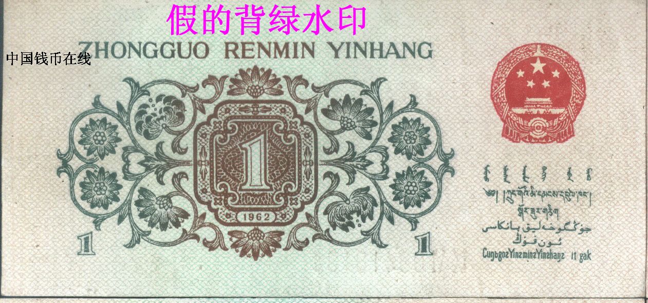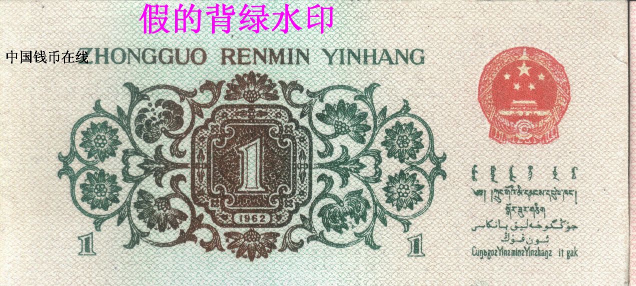 第三套人民币制作精美,过去在2000年以前从未发现过赝品。但近年来,造假者采用高科技手法将第三套人民币中的1962年“背绿水印”壹角(现市价为3500元)真的“背绿水印”是带水印的雕版印刷,假的也是带水印的而且也是雕版印刷的。1962年壹角的“背绿水印”真的是凹凸感很强底文很清晰纸张带有纸胶感、假的背绿是用真的1962年的“凸版水印”壹角水印改制的!而假的“背绿水印”纸胶被药水洗掉了没有纸胶的油润性、假“背绿水印”的正面图案有被洗过的痕迹颜色不正!大家要购买时要以1962年的“凸版水印”壹角的正面为标准来看“背绿水印”的正面是否有过被“药水洗过”的痕迹!假“背绿水印”的背面的底文是后印上去的印质很是粗糙的!另一种假的“背绿水印”就是用真的背绿改制的,他们将普通的“背绿”纸币在沸水中泡开,再将电脑复制的空心五星图形剪下,放进夹层中,“合成”后阴干夹平。集币爱好者除仔细观察水印是否自然外,还应检查纸边上有无“合成”痕迹。