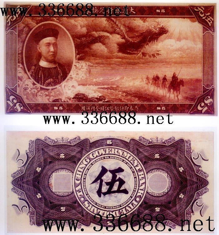 宣统年间(1909年-1911年)大清银行发行全国通用的银圆兑换券一组面值壹圆、伍圆、拾圆、百圆四种、每种面值都有不同的试色票、票面左边人为摄政王、右上为日照飞龙图