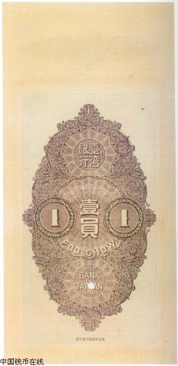 ·光绪21年(1895年)日本占领台湾,光绪26年(1900年)9月成立「台湾银行」,除在台湾发行纸币外,也在中国大陆发行.此票系光绪32年(1906年)在福州发行的番银1元.