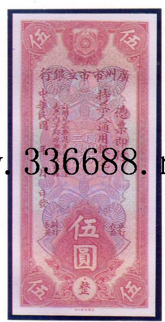 广东市市立银行民国18--21年(1929--1932)银毫券   5元