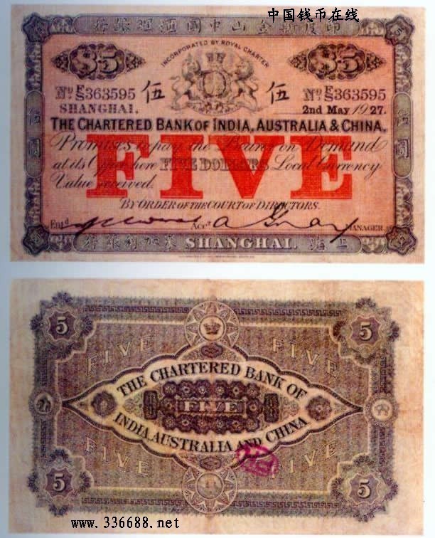 [图文]1927年印度新金山中国汇理银行麦加利银行   5元         ★★★